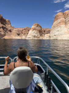 In addition to pontoon boats we also have three 20′ fishing boats with 115 HP motors for smaller groups, faster travel and fishing excursions. For fishing: in Powell we target striped bass; in Bear Lake, Lake Trout and Bonneville Cutthroat; in Flaming Gorge, Lake Trout, Kokanee salmon, rainbow trout, and burbot
